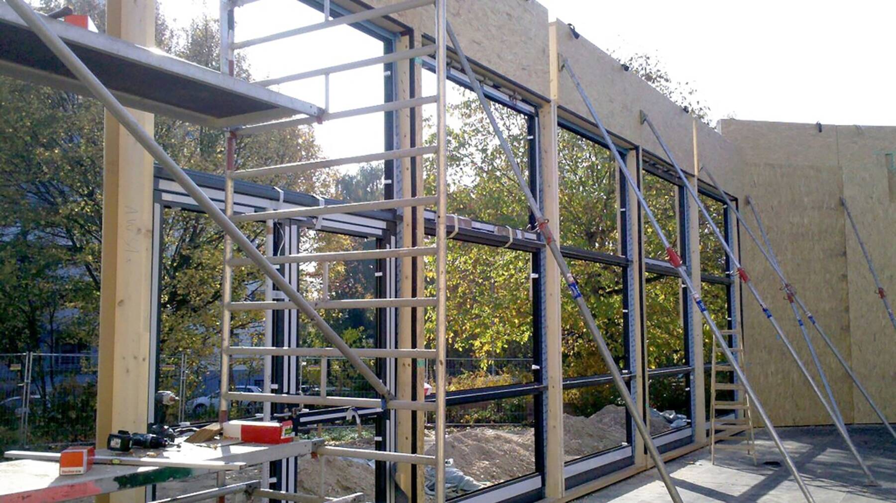 - Außenwände: segmentierter Holzrahmenbau, innen mit Vorsatzschalen als Installationsebenen, außen mit gebogener Unterkonstruktion und Holzschalung